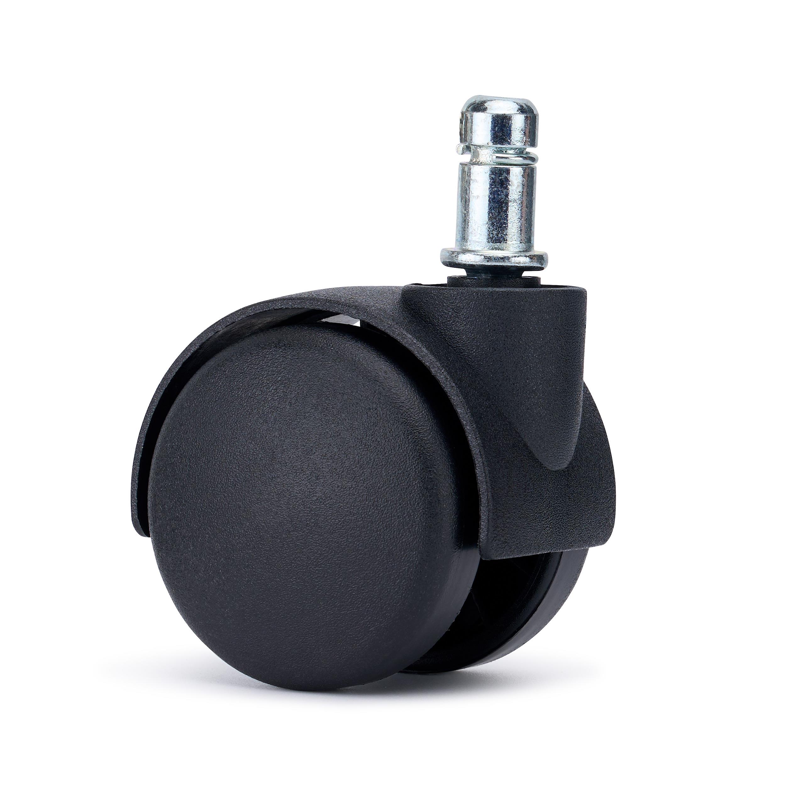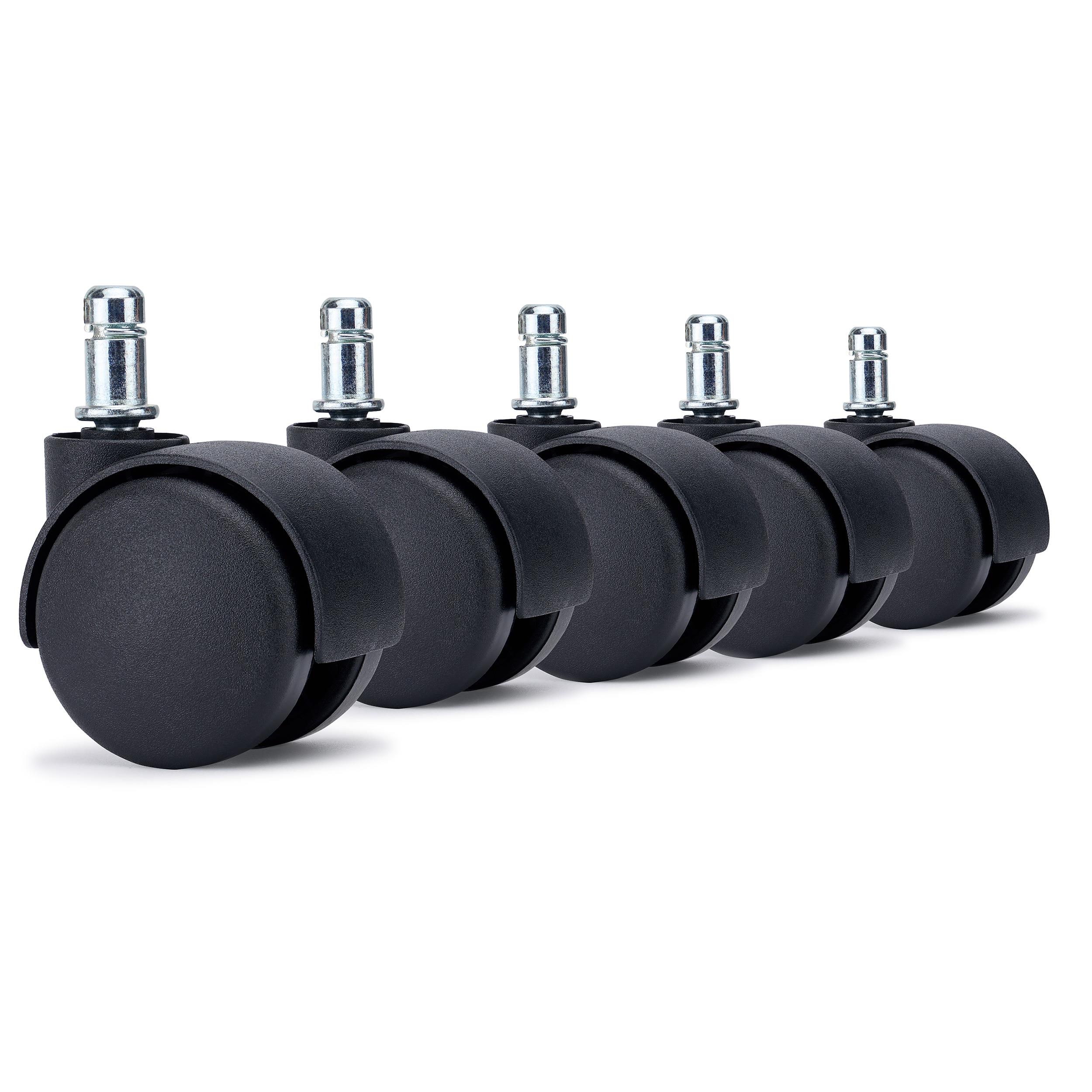 Komplet 5 plastikowych kółek SPIN przeznaczonych do krzeseł i foteli biurowych. Zestaw wyposażono w standardowy trzpień montażowy o średnicy 11 mm, dzięki czemu kółka są kompatybilne z większością modeli krzeseł dostępnych na rynku.