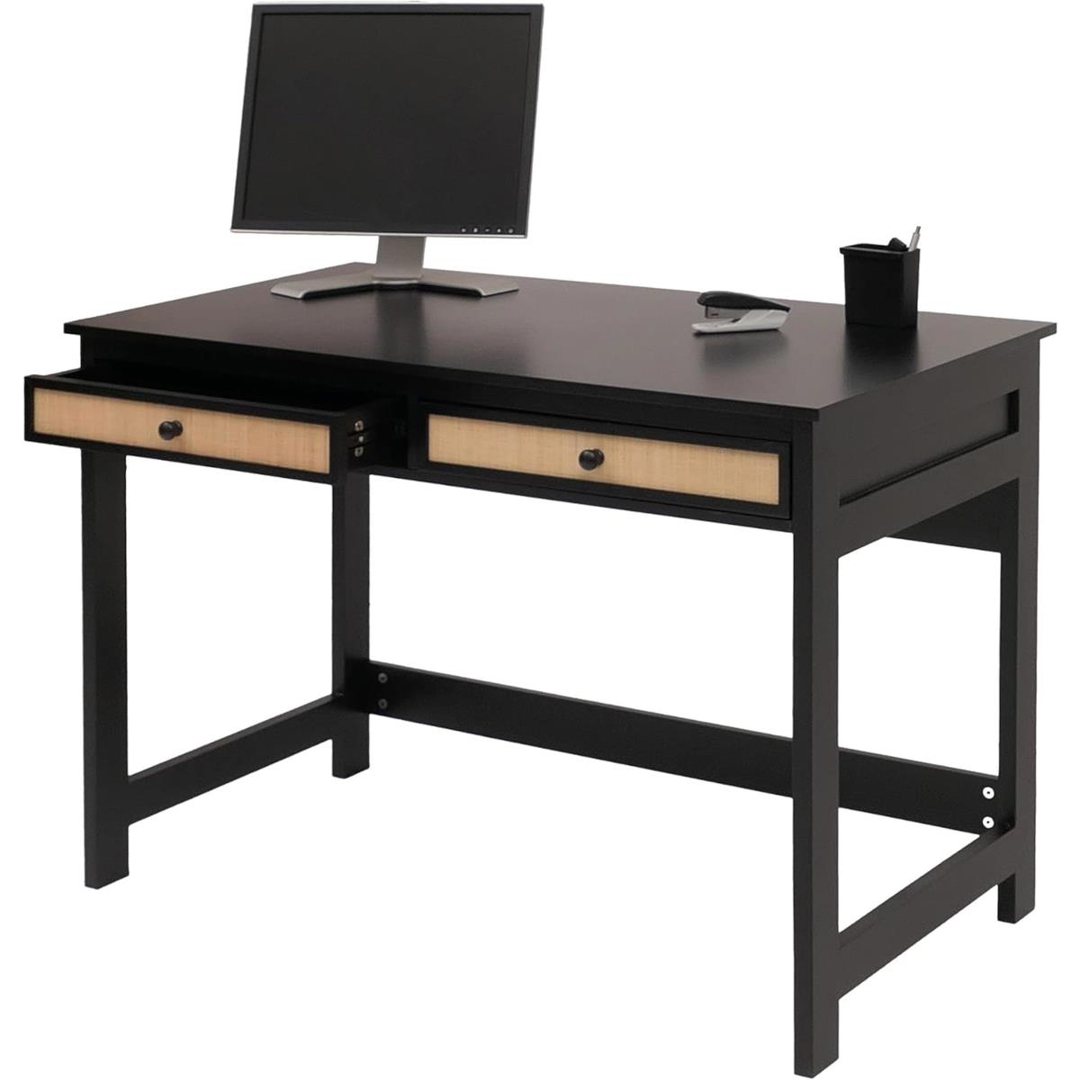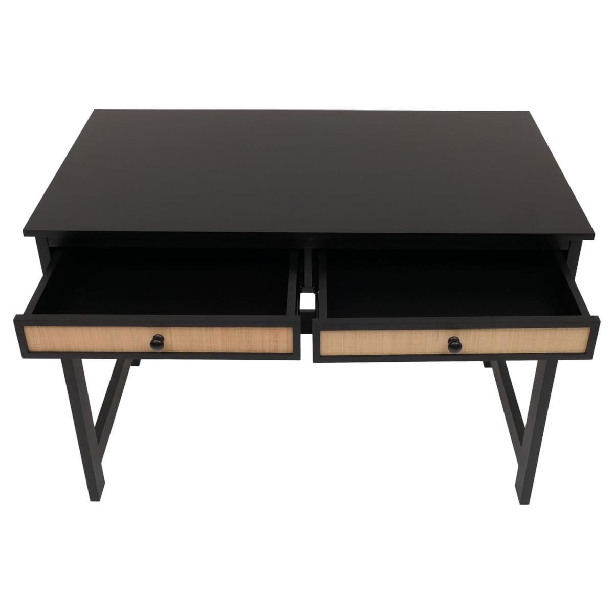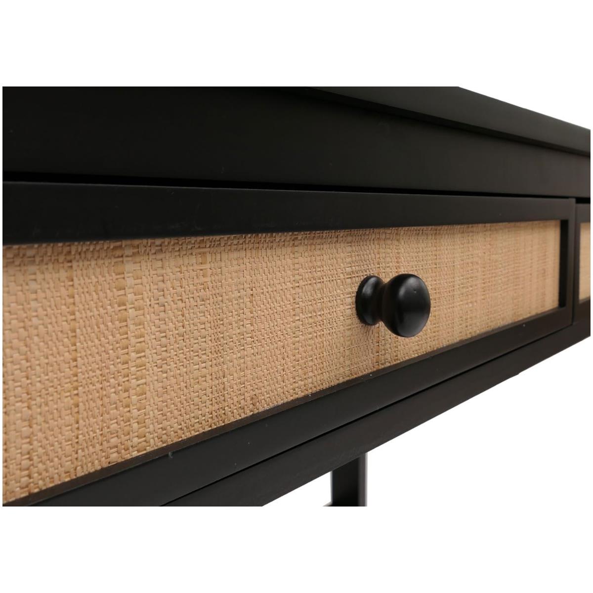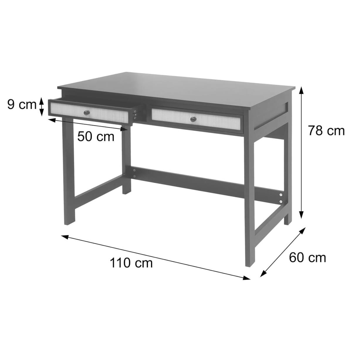 Biurko jest wyposażone w dwie wygodne szuflady z prowadnicami, które zapewniają miejsce do przechowywania dokumentów lub dowolnych innych przedmiotów. Wymiary zewnętrzne szuflad to 9x50x37 cm (wysokość x szerokość x głębokość), natomiast wymiary wewnętrzne to 6x44x33 cm. Wyróżniającym się elementem są fronty szuflad z rafii, które nadają biurku naturalny i ciepły charakter.