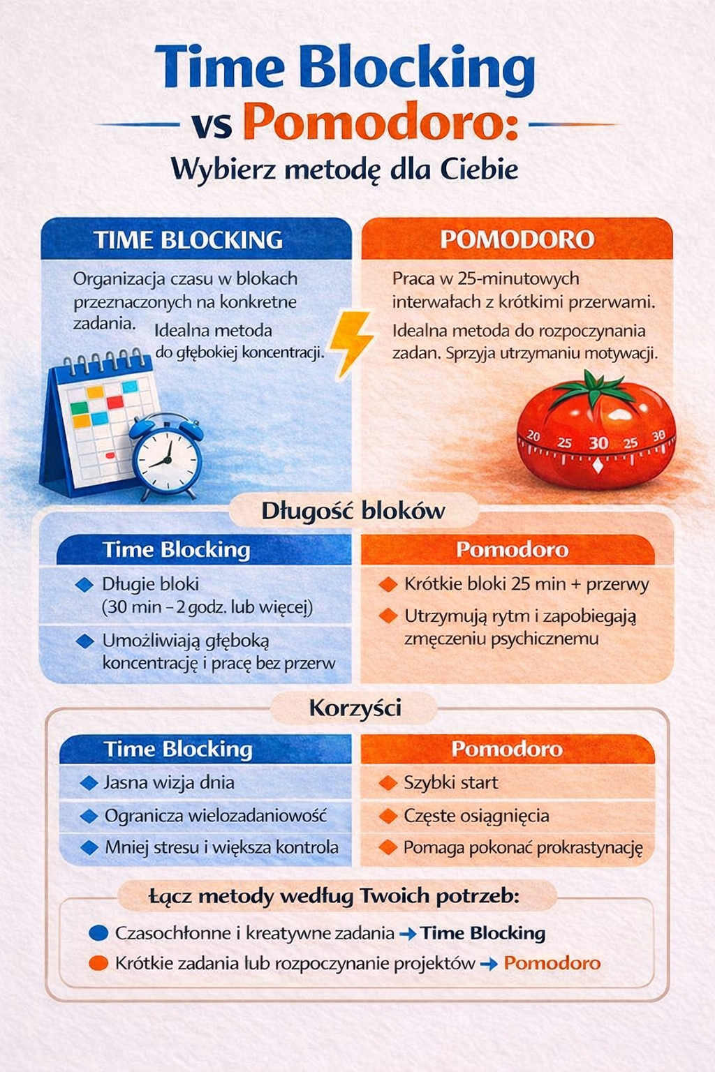 W porównaniu z innymi metodami zwiększającymi produktywność time bloking wyróżniają konkretne cechy. Inne popularne metody organizacji czasu to np.: