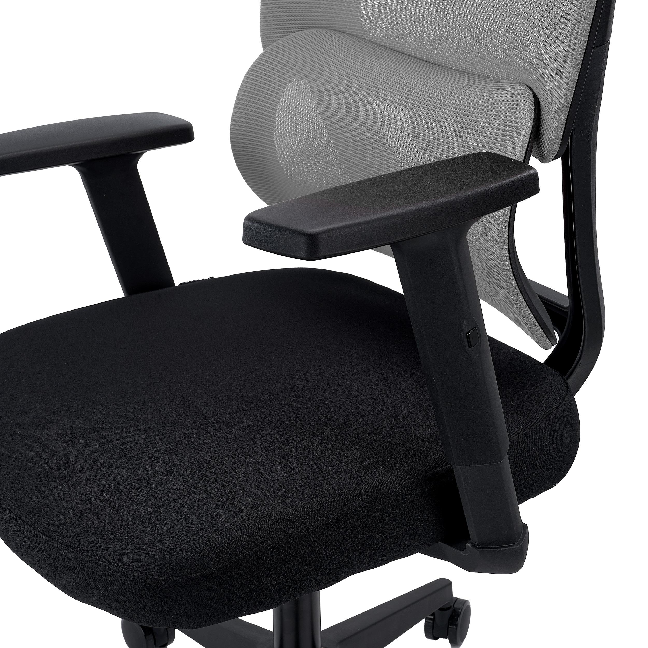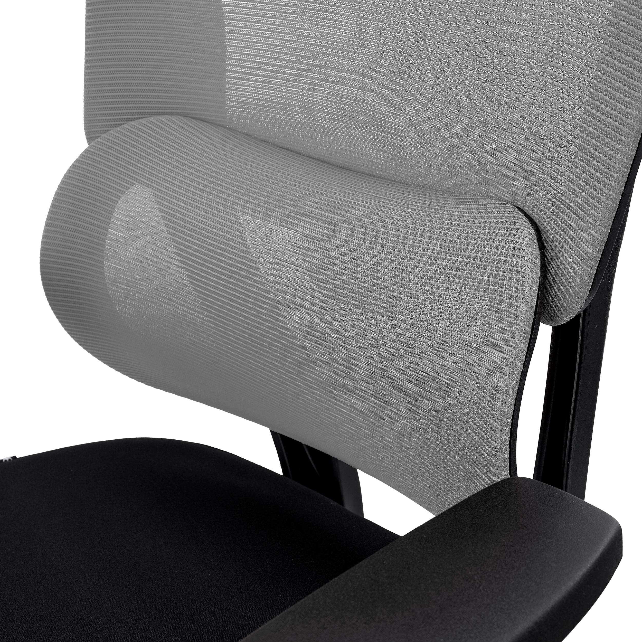 Oparcie ma zaawansowaną ergonomiczną konstrukcję z adaptacyjnym podparciem lędźwiowym. Ta cecha wyraźnie odróżnia prezentowany fotel na tle innych modeli, ponieważ część lędźwiowa dopasowuje się do wagi użytkownika, zapewniając optymalne wsparcie dla dolnej części pleców.