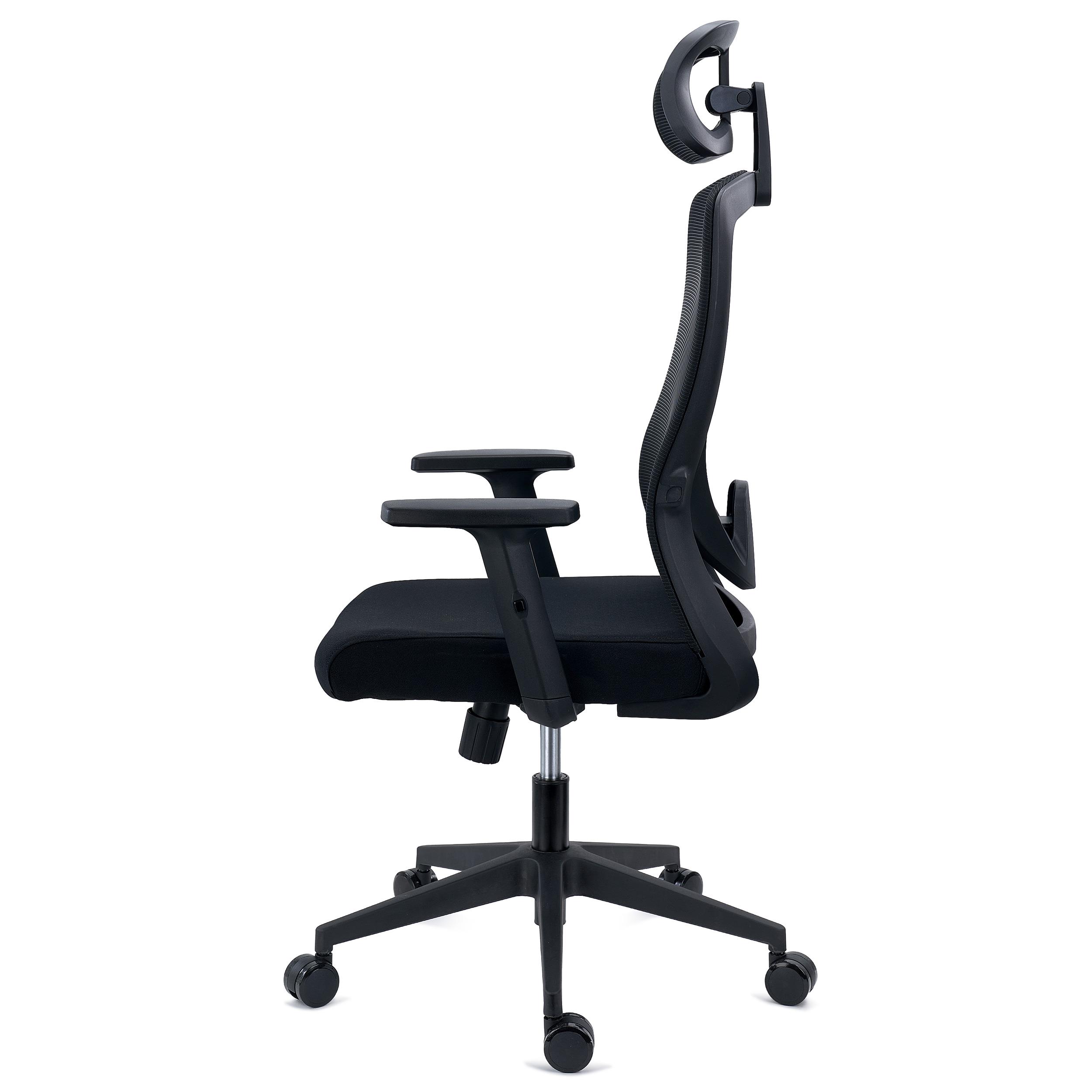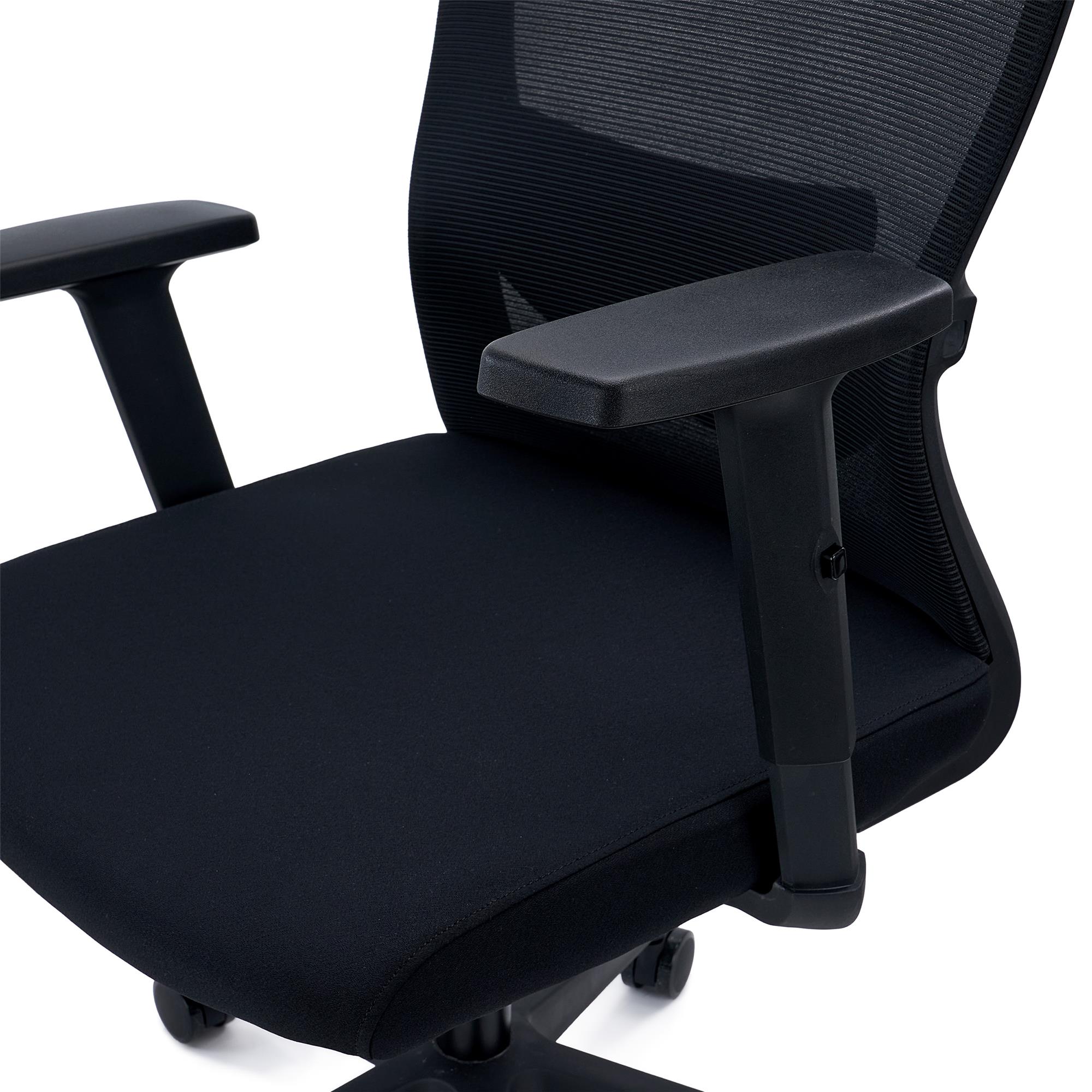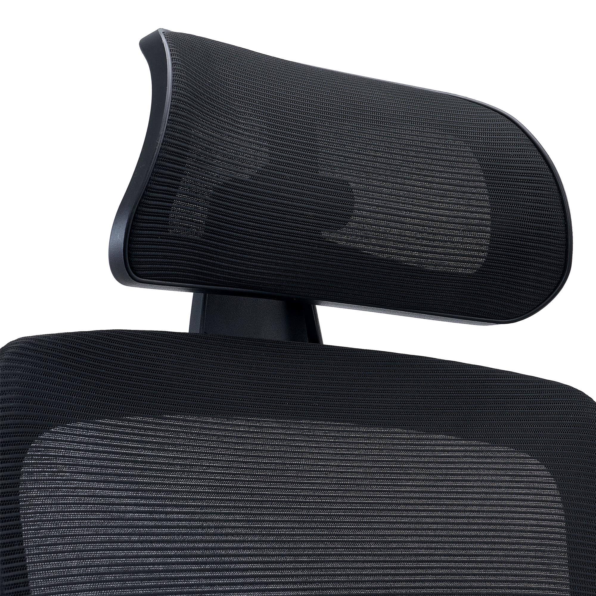 Podłokietniki fotela mają regulowaną wysokość. Ich solidna konstrukcja stanowi dopełnienie tego wytrzymałego krzesła do wymagających zastosowań. Regulowany zagłówek, również tapicerowany oddychającą siatką, pozwala na dopasowanie wysokości i kąta nachylenia. Regulacja tych elementów ułatwia osiągnięcie odpowiedniej ergonomii pracy.