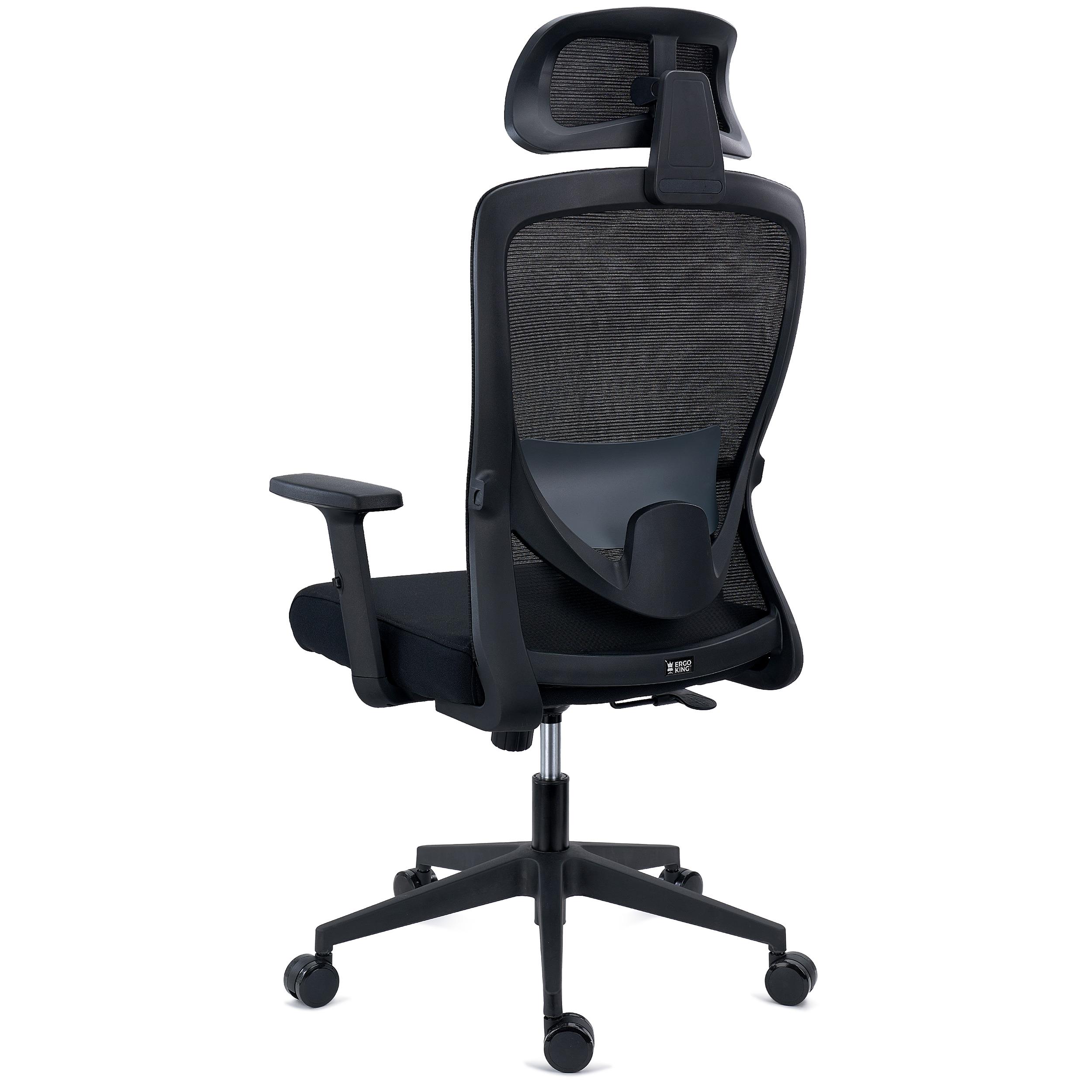 Oparcie ma ergonomiczny kształt, dzięki czemu pozwala na przyjęcie optymalnej postawy ciała, co może być utrudnione przy konstrukcjach bez krzywizny. Podparcie lędźwiowe ma regulowaną wysokość, co umożliwia jeszcze lepsze dopasowanie do użytkownika.