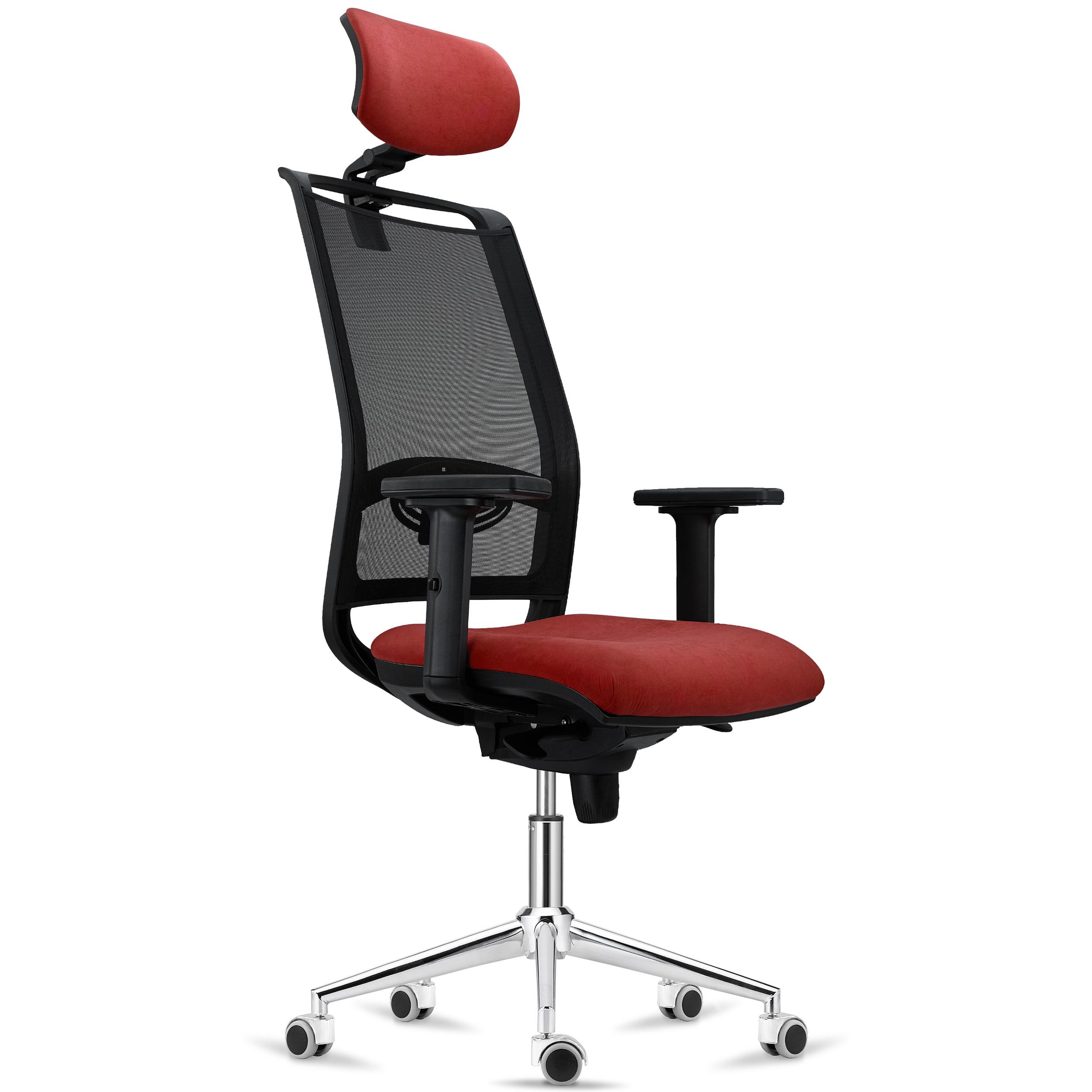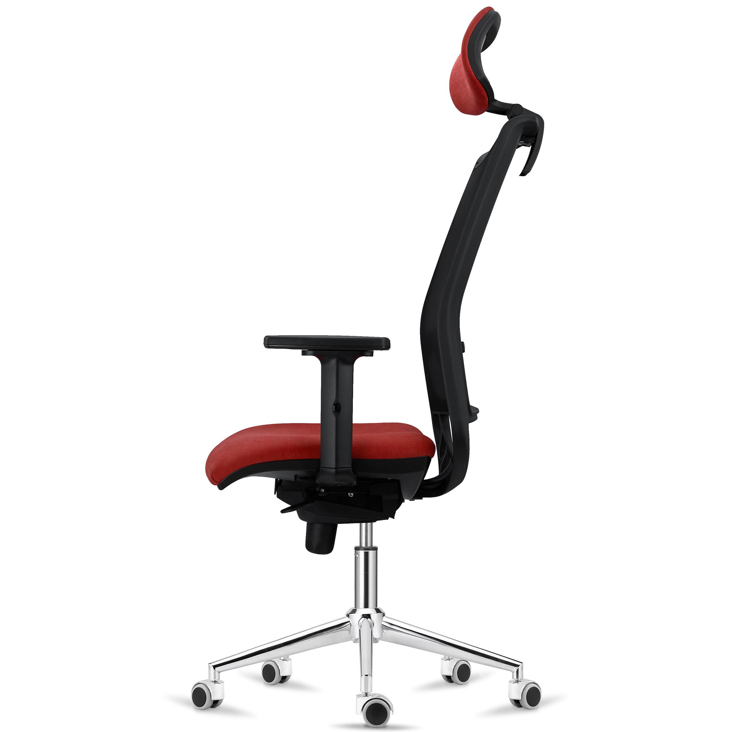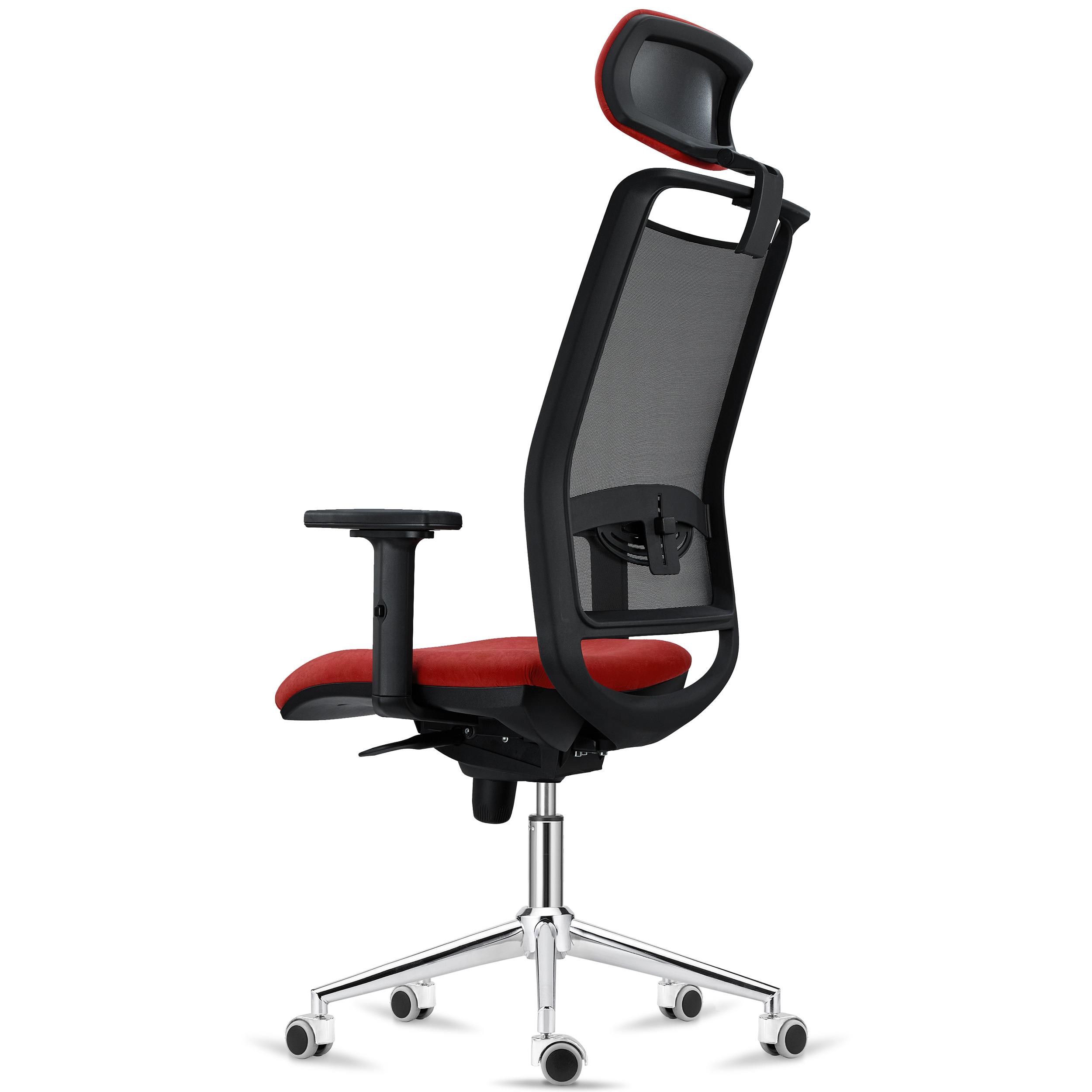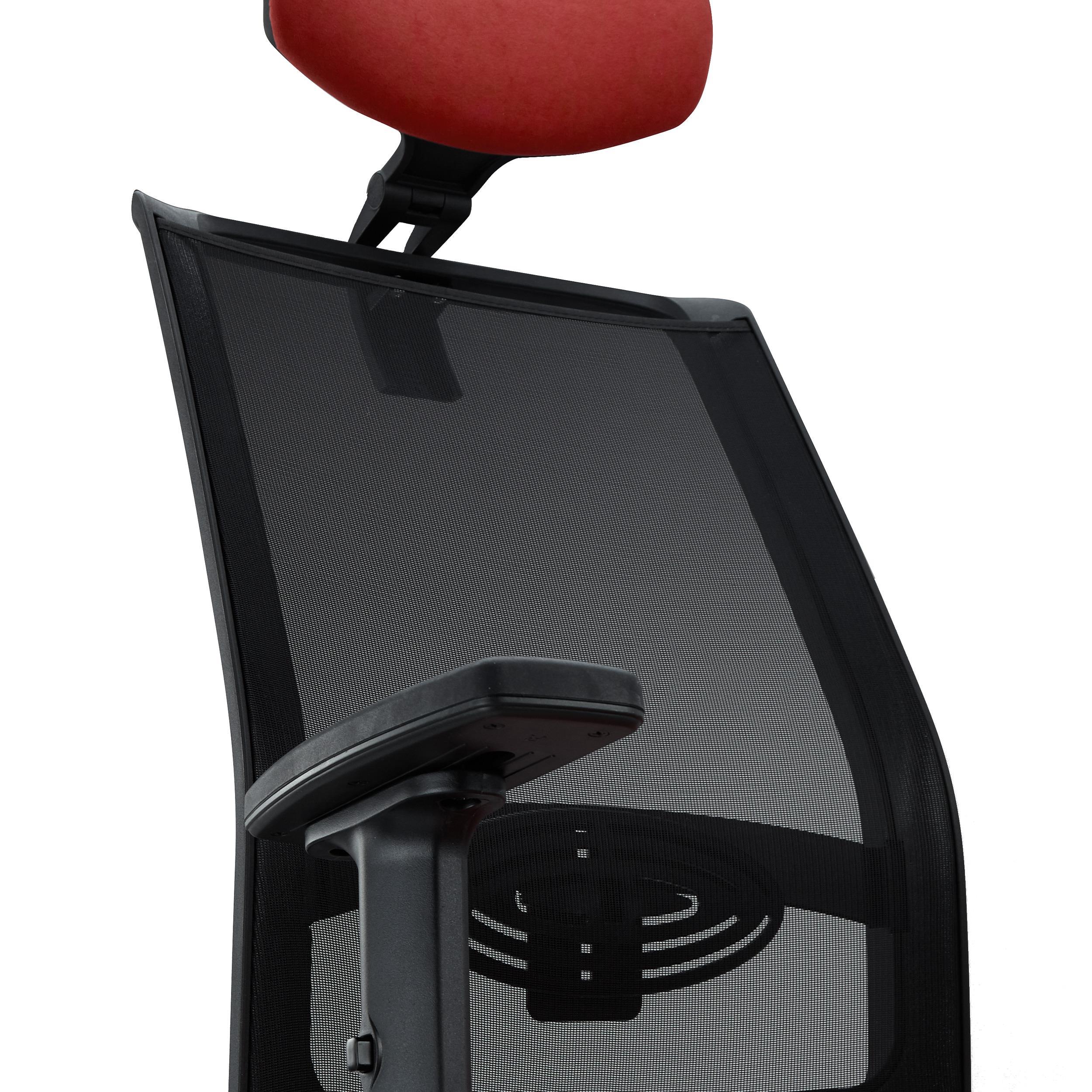 Fotel Biurowy Ergonomiczny NEPTUNO, Zagłówek, Podparcie Lędźwi, 8h Pracy, Metalowa Podstawa, Czarna Siatka i Czerwona Tkanina