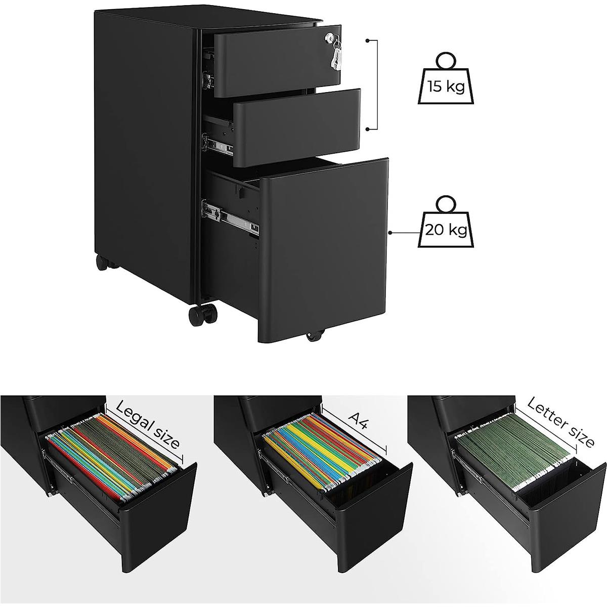 W dwóch górnych szufladach można przechowywać dokumenty formatu A4 w pozycji poziomej. Dolna szuflada, bardziej przestronna, idealnie nadaje się do przechowywania wiszących segregatorów, dzięki czemu wszystkie dokumenty są doskonale uporządkowane. Jest to funkcjonalne rozwiązanie do przechowywania w biurze, dzięki któremu można dobrze zorganizować biurko i utrzymać porządek wśród wszystkich dokumentów. Górne szuflady mają nośność 15 kg, a dolna szuflada wytrzymuje obciążenie do 20 kg, więc nie ma problemów z wytrzymałością.