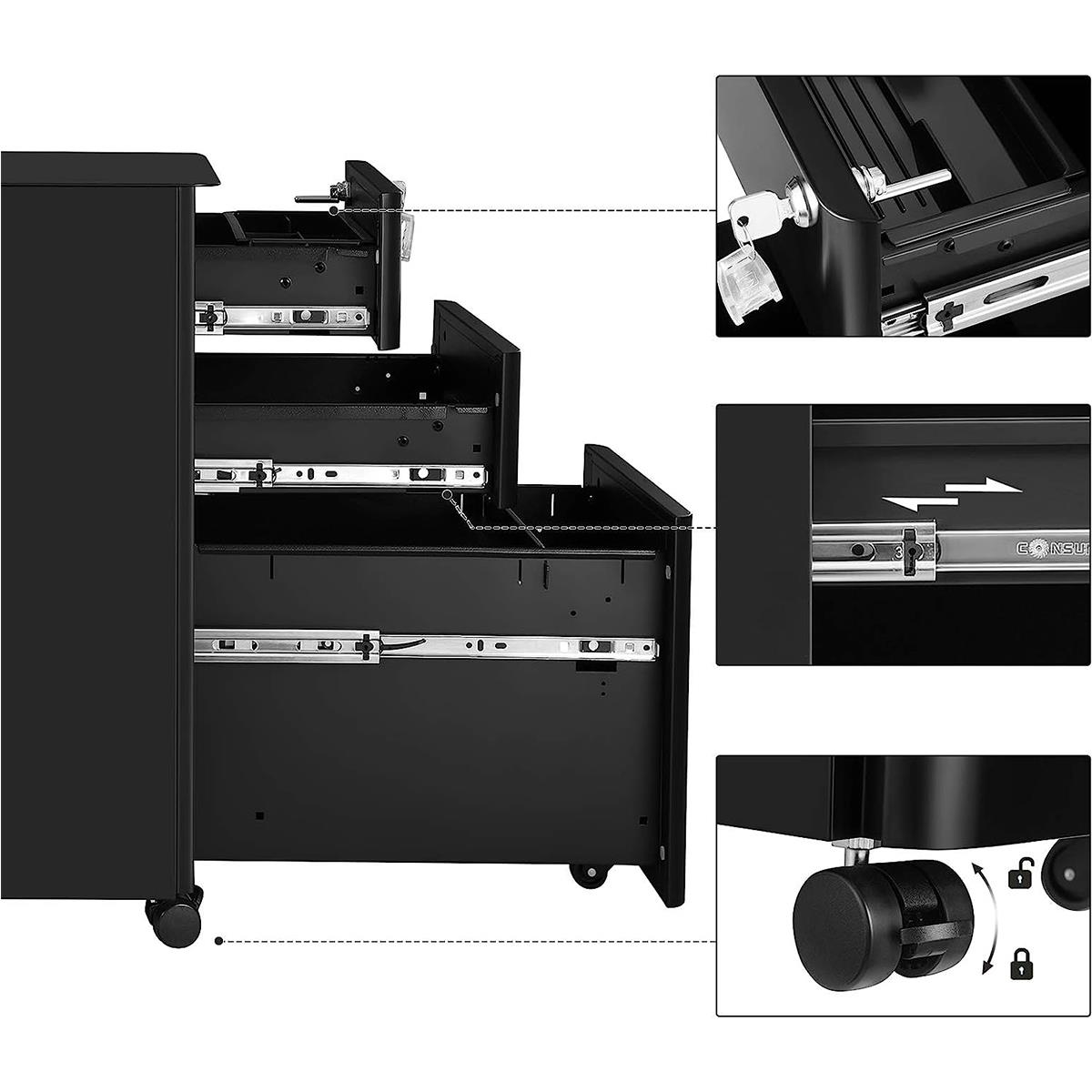 Ten funkcjonalny kontenerek ma 3 szuflady, z których jedna jest zamykana na klucz, co pozwala na odpowiednią organizację przestrzeni. Ma nowoczesny i stonowany design. Szuflady są całkowicie wyjmowane, a górna szuflada jest zamykana na klucz, co gwarantuje bezpieczeństwo dokumentów.