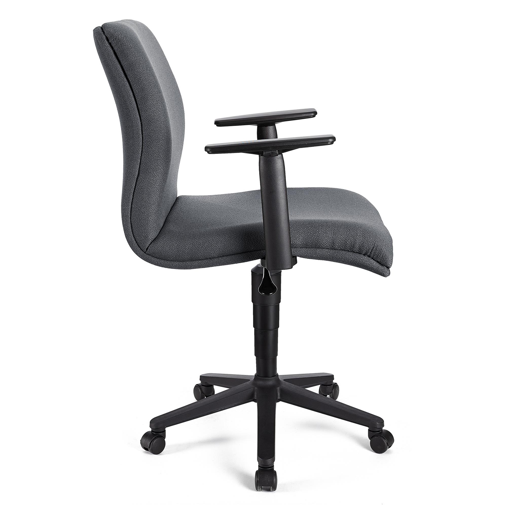 Siedzisko oraz oparcie posiadają wygodną tapicerkę, której gęste wypełnienie wysokiej jakości sprawia, że siedzenie na nim jest prawdziwą przyjemnością. Podłokietniki z regulacją wysokości ułatwiają znalezienie idealnej pozycji, zapewniając dodatkowy komfort.