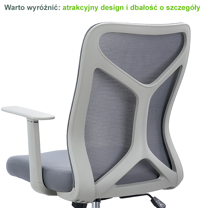 Oparcie jest tapicerowane oddychającą siatką. W widoku z boku widoczny jest jego ergonomiczny kształt, podążający za krzywizną pleców, co pozwala na optymalne podparcie kręgosłupa. Siatka jest bardzo wygodnym materiałem, zapewniającym dobrą wentylację, co jest szczególnie istotne w najgorętszych miesiącach. Siatka jest również bardzo wytrzymała i można ją łatwo wyczyścić zwykłą wilgotną szmatką.