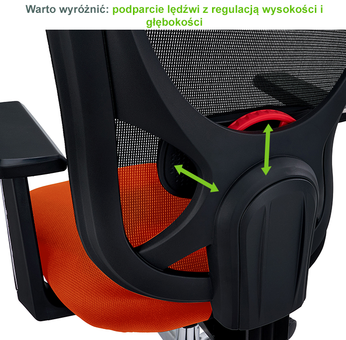 Podparcie lędźwiowe, regulowane zarówno pod względem głębokości, jak i wysokości, jest idealnym uzupełnieniem tak wygodnego oparcia. Po raz kolejny mówimy o możliwości dostosowania do indywidualnych potrzeb użytkownika, co przekłada się na większy komfort w dolnej części pleców, a co za tym idzie, lepsze samopoczucie.