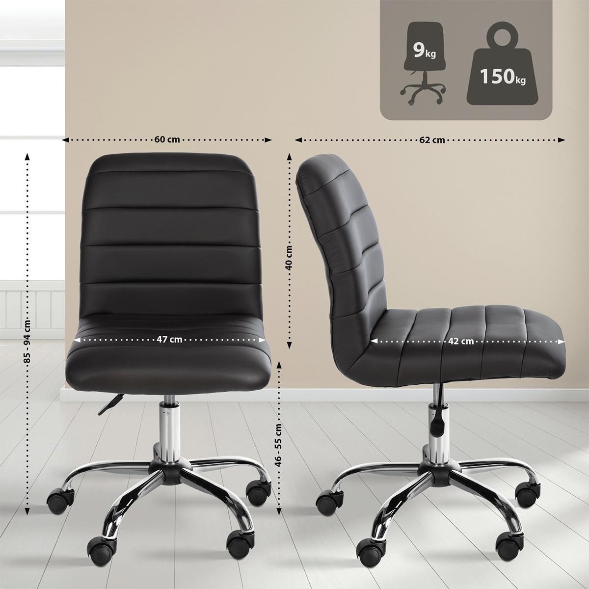 Zarówno siedzisko, jak i oparcie są obficie wyściełane, co zapewnia wysoki komfort nawet podczas wielogodzinnego użytkowania. Brak podłokietników umożliwia łatwe wsunięcie krzesła pod dowolny blat roboczy, a także daje większą swobodę ruchów.