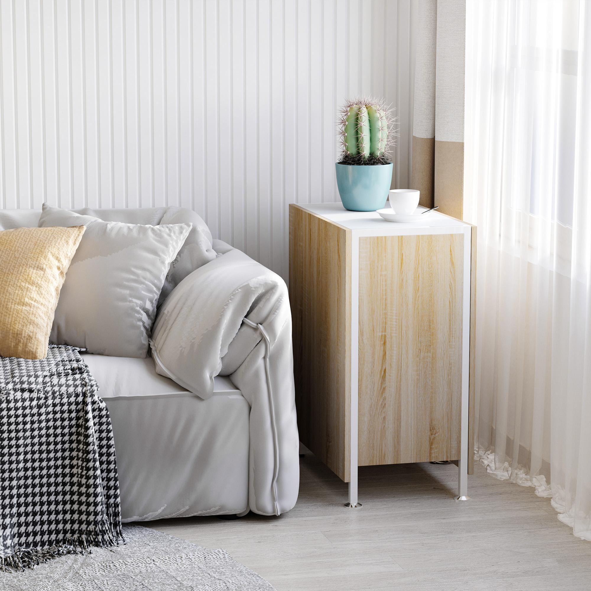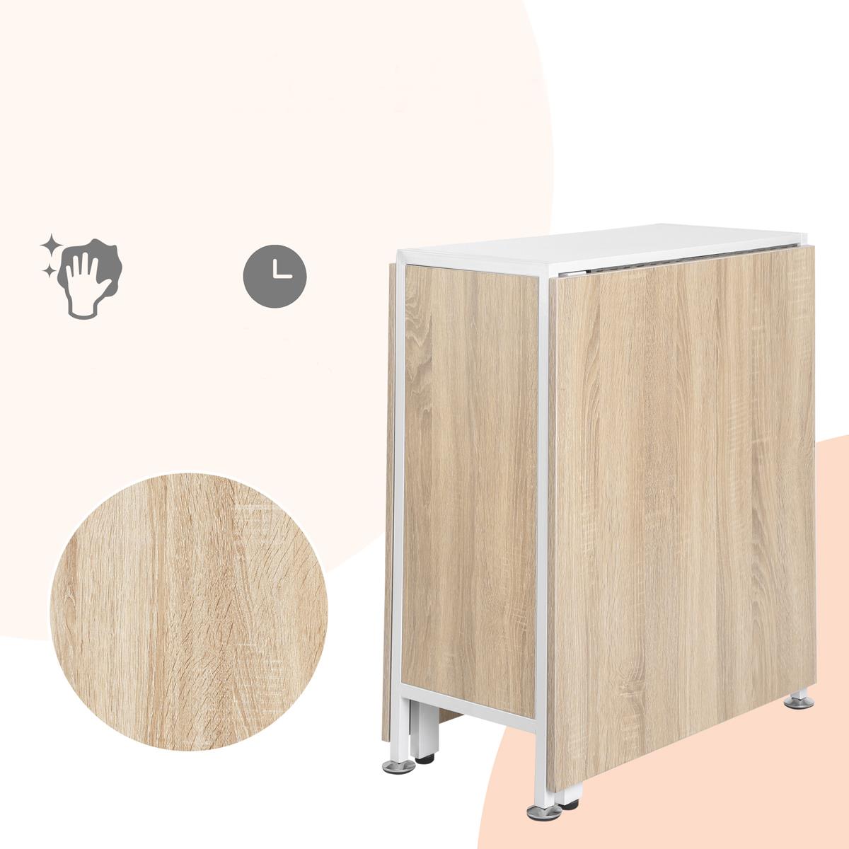 To praktyczny stół z dwoma składanymi skrzydłami, który możesz łatwo dostosować do swoich potrzeb. W zależności od sytuacji możesz korzystać z jednej lub obu rozłożonych części blatu albo całkowicie złożyć stół, oszczędzając miejsce. To idealne rozwiązanie do małych biur, kuchni czy aneksów jadalnianych.