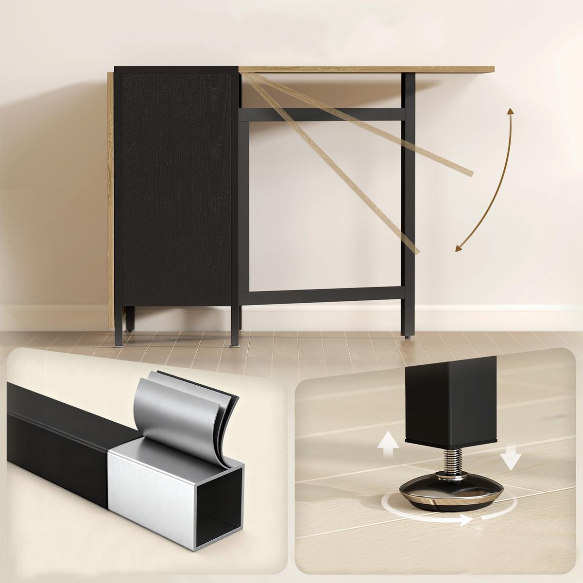 To praktyczny stół z dwoma składanymi skrzydłami, który możesz łatwo dostosować do swoich potrzeb. W zależności od sytuacji możesz korzystać z jednej lub obu rozłożonych części blatu albo całkowicie złożyć stół, oszczędzając miejsce. To idealne rozwiązanie do małych biur, kuchni czy aneksów jadalnianych.