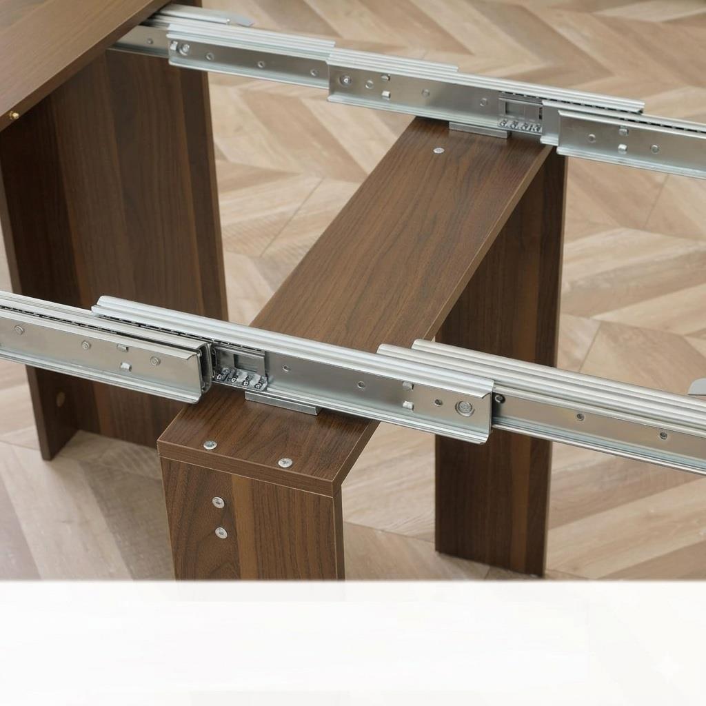 Rozkładanie stołu jest szybkie i wygodne – wystarczy rozsunąć blat i dodać dodatkowe panele, które na co dzień mogą być przechowywane pod stołem. Solidne stalowe prowadnice zapewniają płynne działanie, dzięki czemu jedna osoba bez problemu poradzi sobie z jego rozłożeniem.