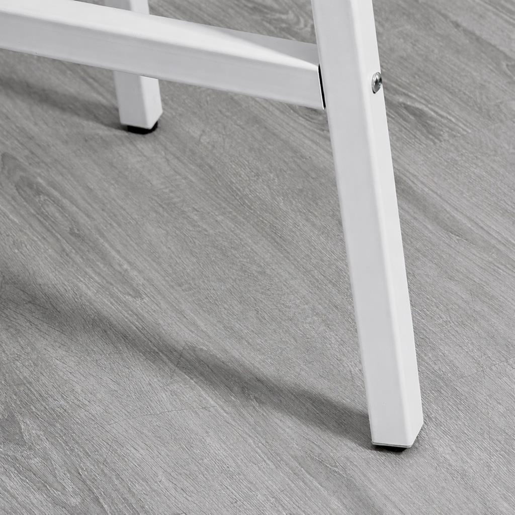 Blat jest zrobiony z płyty wiórowej i ma trwałe wykończenie, które wytrzymuje codzienne użytkowanie. Stalowe nogi są stabilne i zostały wyposażone w antypoślizgowe podkładki, które zwiększają przyczepność i chronią podłogę. Całość jest zaprojektowana z myślą o wygodzie i trwałości.