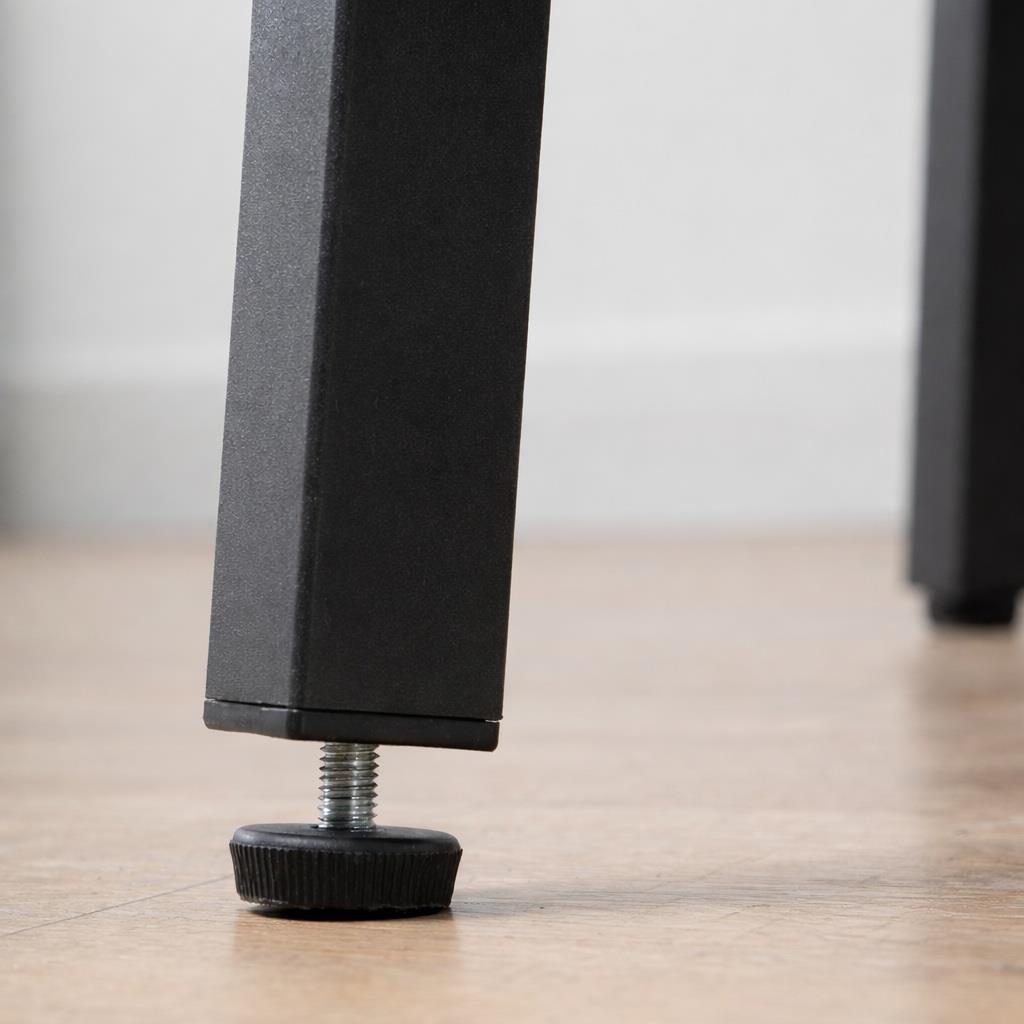 Blat jest zrobiony z płyty wiórowej i ma trwałe wykończenie, które wytrzymuje codzienne użytkowanie. Stalowe nogi są stabilne i zostały wyposażone w antypoślizgowe podkładki, które zwiększają przyczepność i chronią podłogę. Całość jest zaprojektowana z myślą o wygodzie i trwałości.