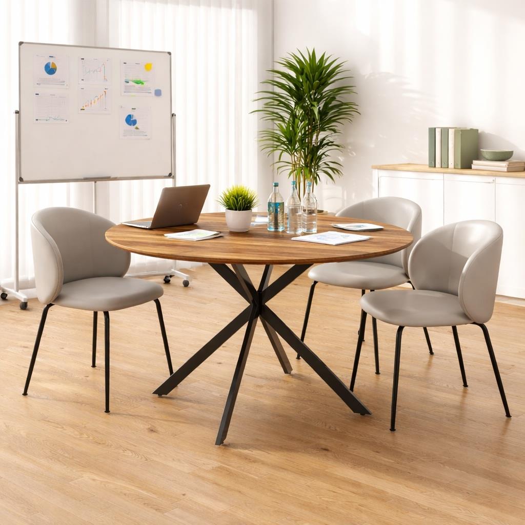 Model ten wyróżnia się solidną konstrukcją opartą na stalowych nogach w kształcie litery X, które w połączeniu okleiną blatu o wyglądzie drewna nadają mu wyrazisty styl, pasujący do niemal każdego wystroju. Okrągły kształt stołu sprzyja integracji i komunikacji, sprawiając, że będzie to idealny mebel do przestrzeni biurowej.
