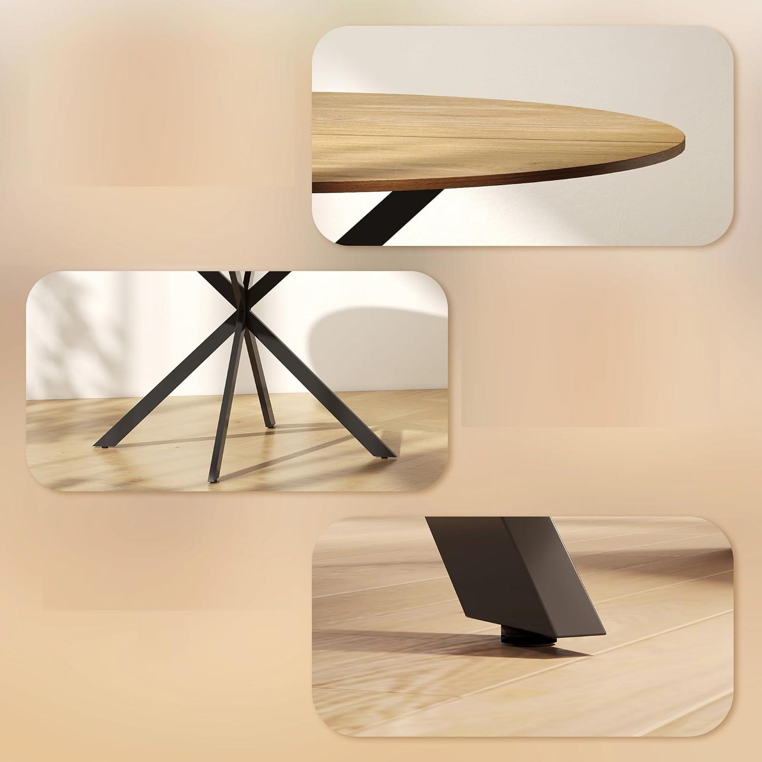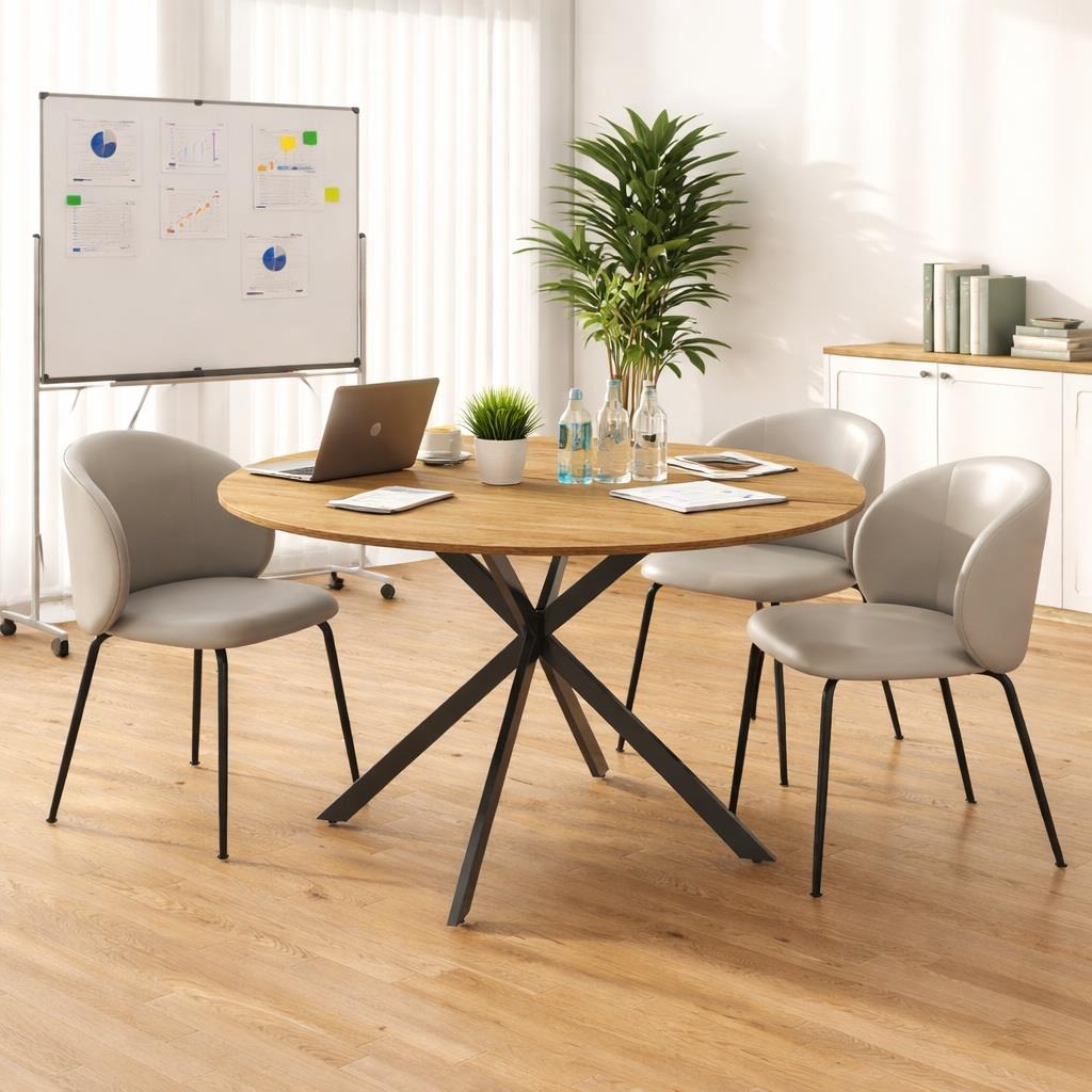 Model ten wyróżnia się solidną konstrukcją opartą na stalowych nogach w kształcie litery X, które w połączeniu okleiną blatu o wyglądzie drewna nadają mu wyrazisty styl, pasujący do niemal każdego wystroju. Okrągły kształt stołu sprzyja integracji i komunikacji, sprawiając, że będzie to idealny mebel do przestrzeni biurowej.