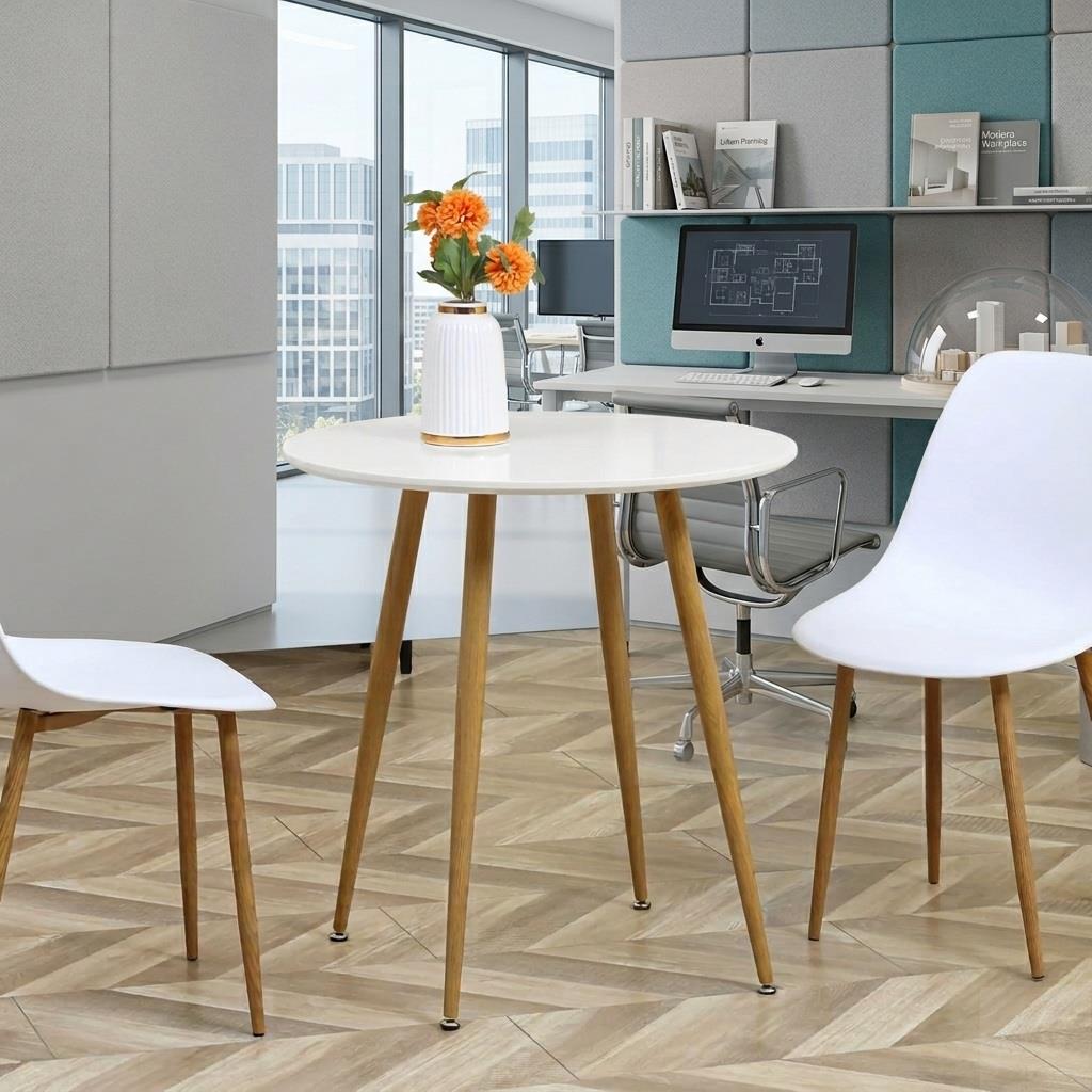Model wyróżnia się minimalistycznym designem oraz okrągłym blatem w kolorze matowej bieli, który w połączeniu z nogami o wykończeniu imitującym drewno tworzy spójną, elegancką kompozycję. Powierzchnia została pokryta warstwą ochronnego lakieru, dzięki czemu jest łatwa w utrzymaniu czystości i odporna na codzienne użytkowanie.