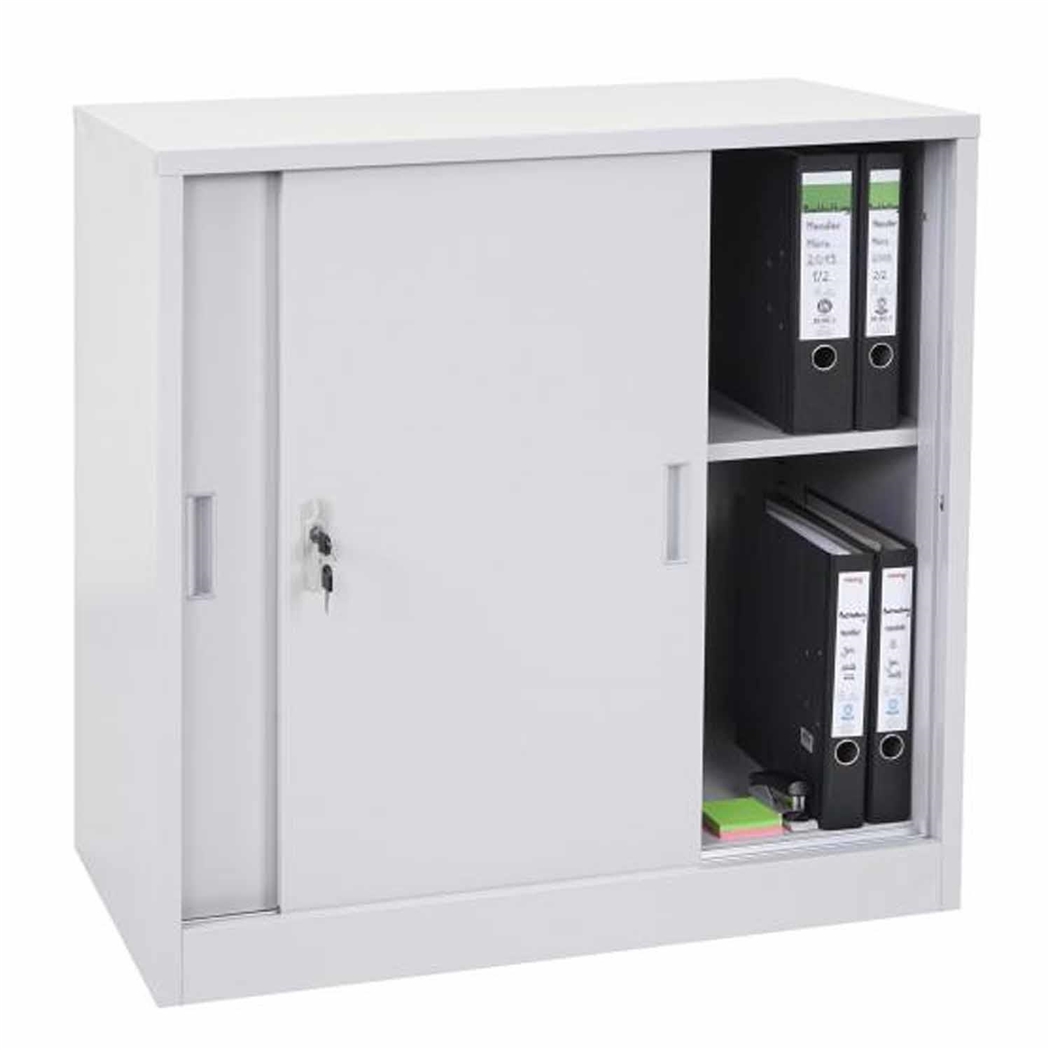 Szafka na dokumenty jest bardzo pojemna i posiada dwoje przesuwnych drzwi wyposażonych w zamek i dwa klucze. Wewnątrz posiada półkę z możliwością regulacji wysokości, co pozwala na dostosowanie przestrzeni do Twoich potrzeb. Zmiana wysokości półki jest bardzo prosta, dając pełną elastyczność i dowolność jeśli chodzi o wymiary przedmiotów umieszczanych w szafce.