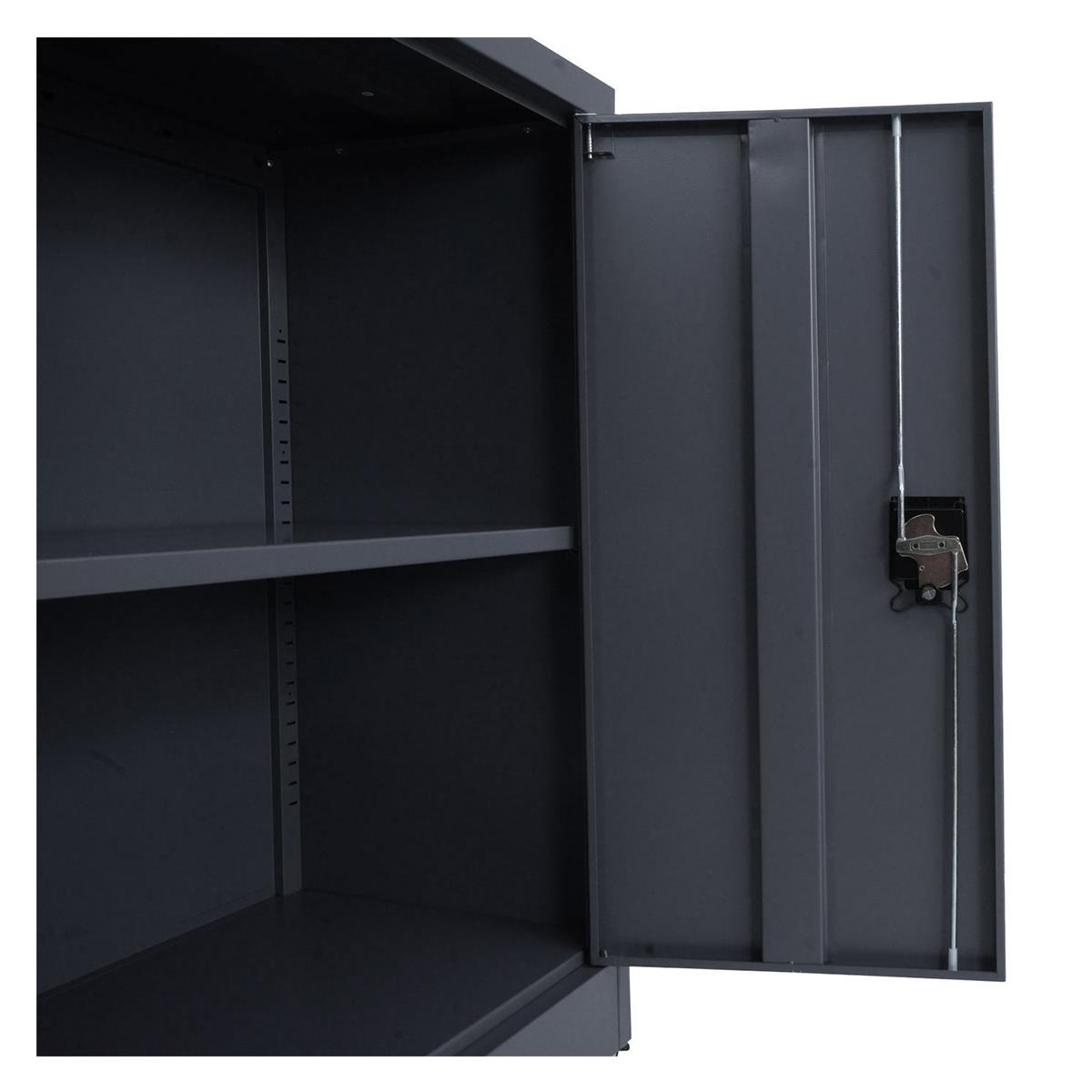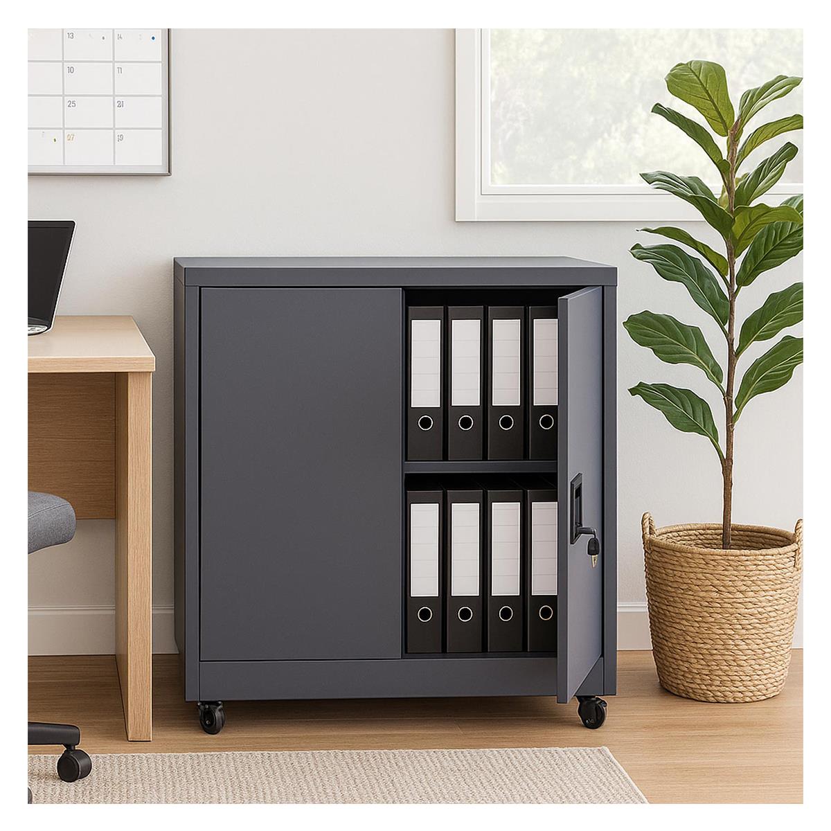 Wewnątrz znajdują się dwie półki, z których jedna ma regulowaną wysokość, co pozwala dostosować przestrzeń do konkretnych potrzeb. Niezależnie od tego, czy chcesz przechowywać duże segregatory, drobne materiały eksploatacyjne czy narzędzia, możesz wygodnie i elastycznie przeorganizować wnętrze. Każda półka wytrzymuje maksymalne obciążenie do 10 kg, zapewniając solidność nawet przy pełnym załadowaniu.