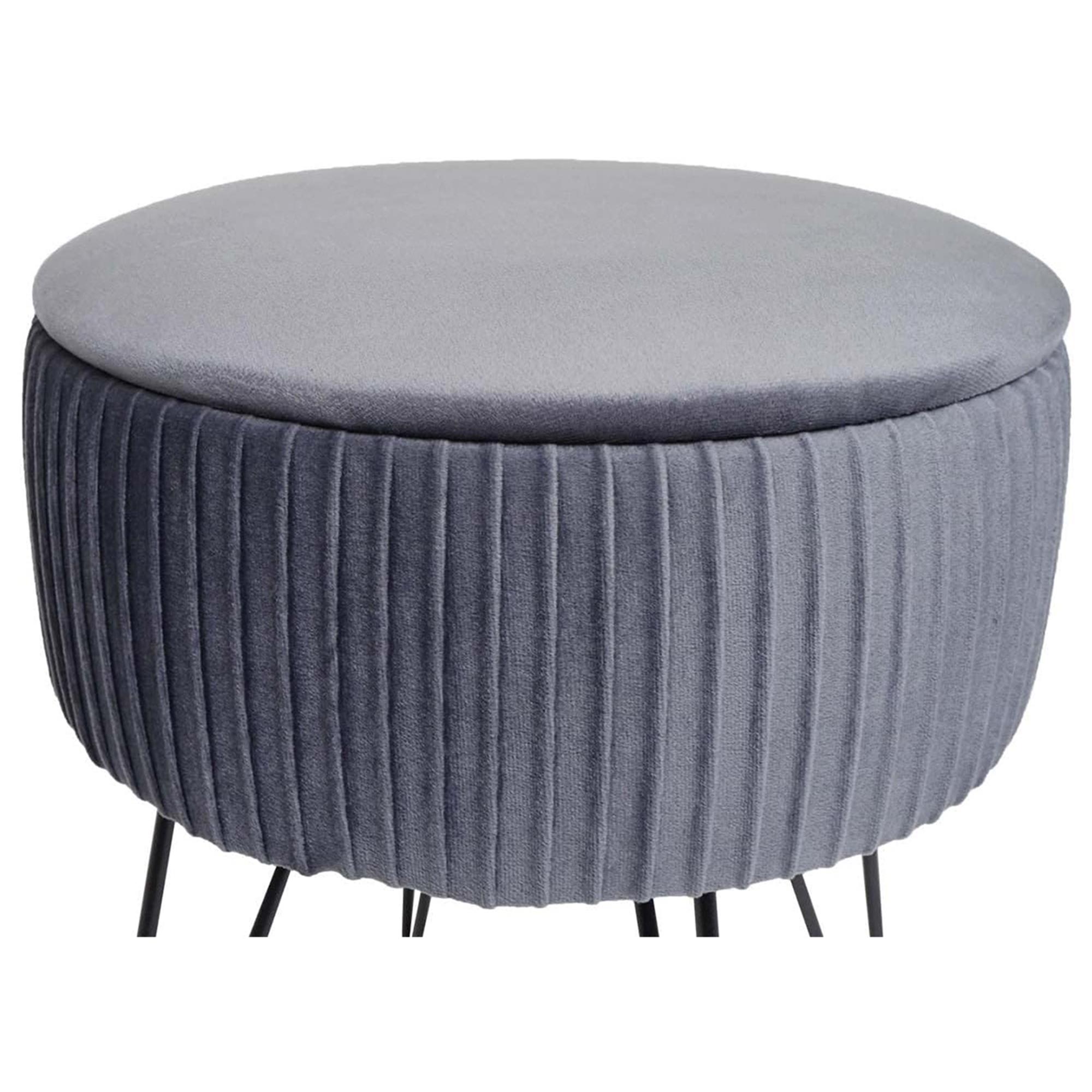 Stołeczek jest pokryty miękką i wytrzymałą tkaniną przypominającą aksamit, która nadaje mu wyrafinowany wygląd, również dzięki ozdobnym zakładkom. Jest to produkt, który z pewnością nie pozostaje niezauważony.