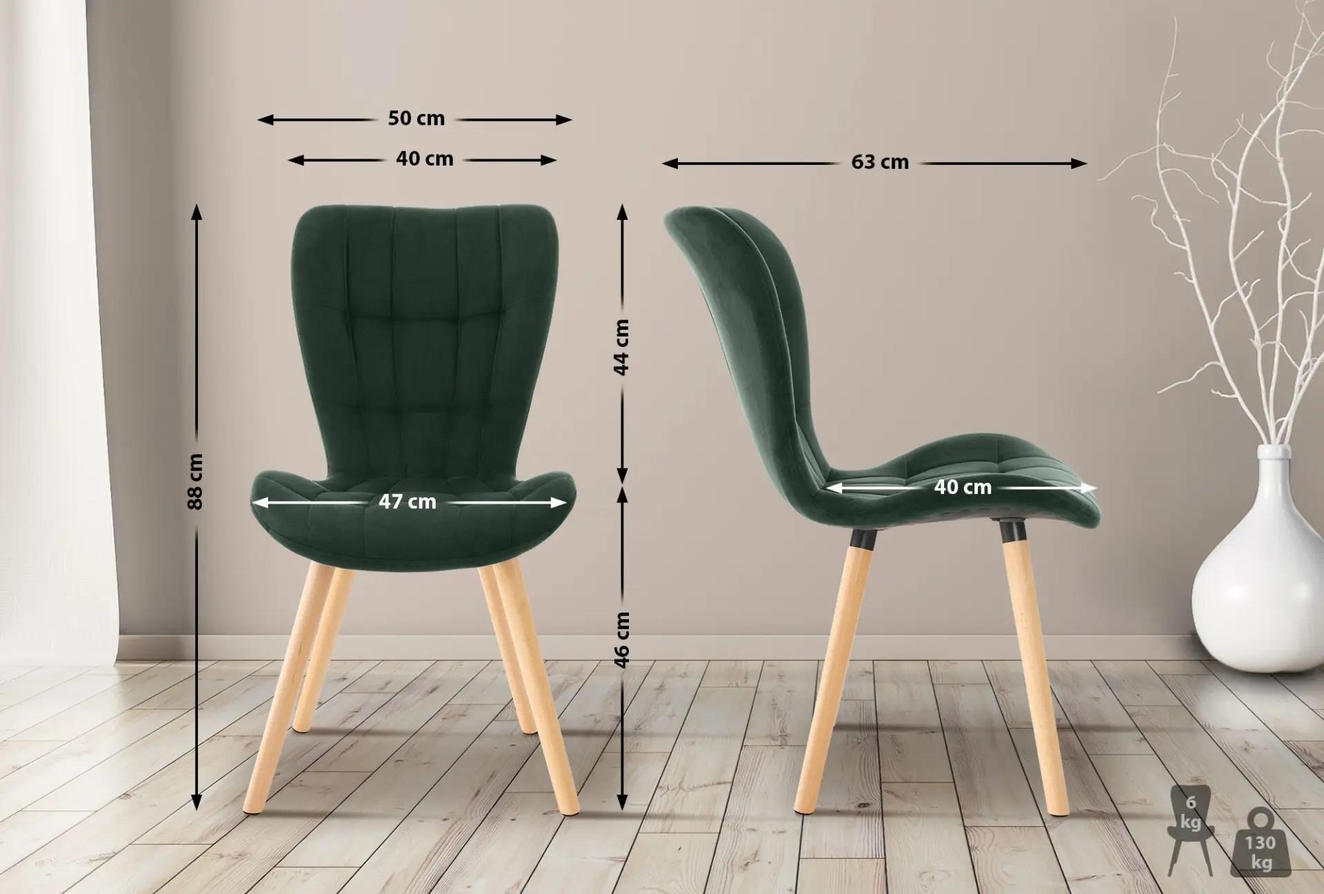 Krzesła wykonane zostały z wysokiej jakości materiałów, dzięki czemu będą służyć przez wiele lat w doskonałym stanie. Drewniane nogi są bardzo solidne i wytrzymałe, a ponadto dodają krzesłu bardzo atrakcyjnego i oryginalnego wyglądu. Krzesła są tapicerowane wysokiej jakości aksamitną tkaniną, która jest bardzo przyjemna w dotyku, a zarazem łatwa w czyszczeniu i pielęgnacji.