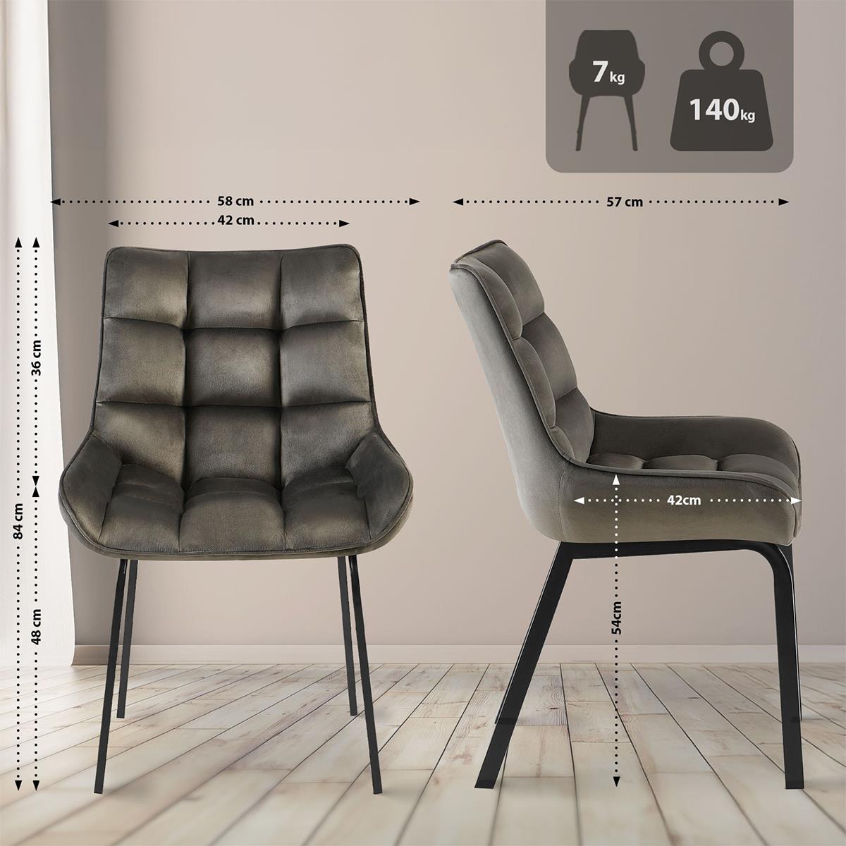 Każde krzesło zostało wyposażone w wygodną wyściółkę z pikowaniem, która pokrywa zarówno siedzisko, jak i oparcie. Siedzisko jest lekko zaokrąglone po bokach, co nadaje krzesłu elegancji i oryginalności.