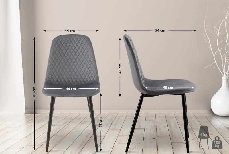 Model ten jest tapicerowany wysokiej jakości aksamitną tkaniną, dzięki czemu ma szansę posłużyć w doskonałym stanie przez długi czas. Metalowa konstrukcja z 4 niezależnymi nogami gwarantuje solidność i stabilność krzesła, zapewniając nośność do 150 kg.